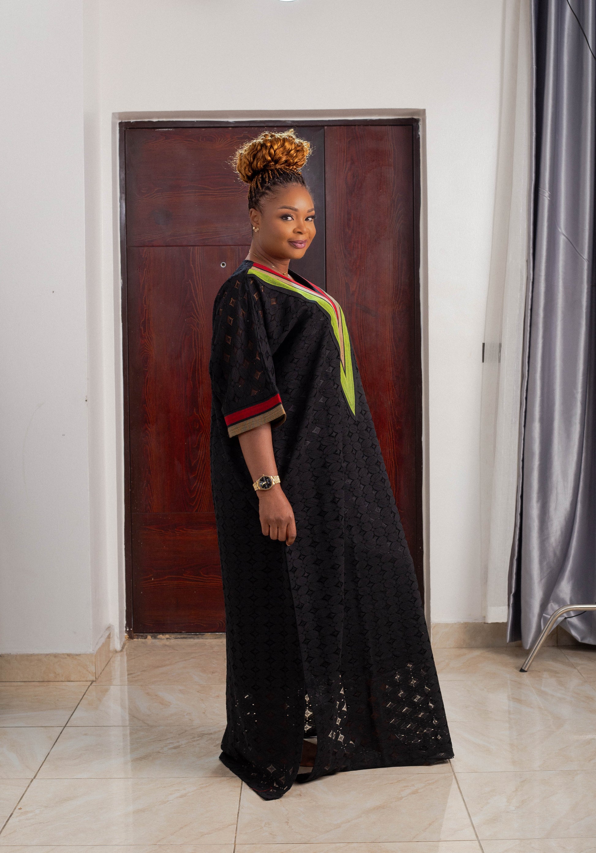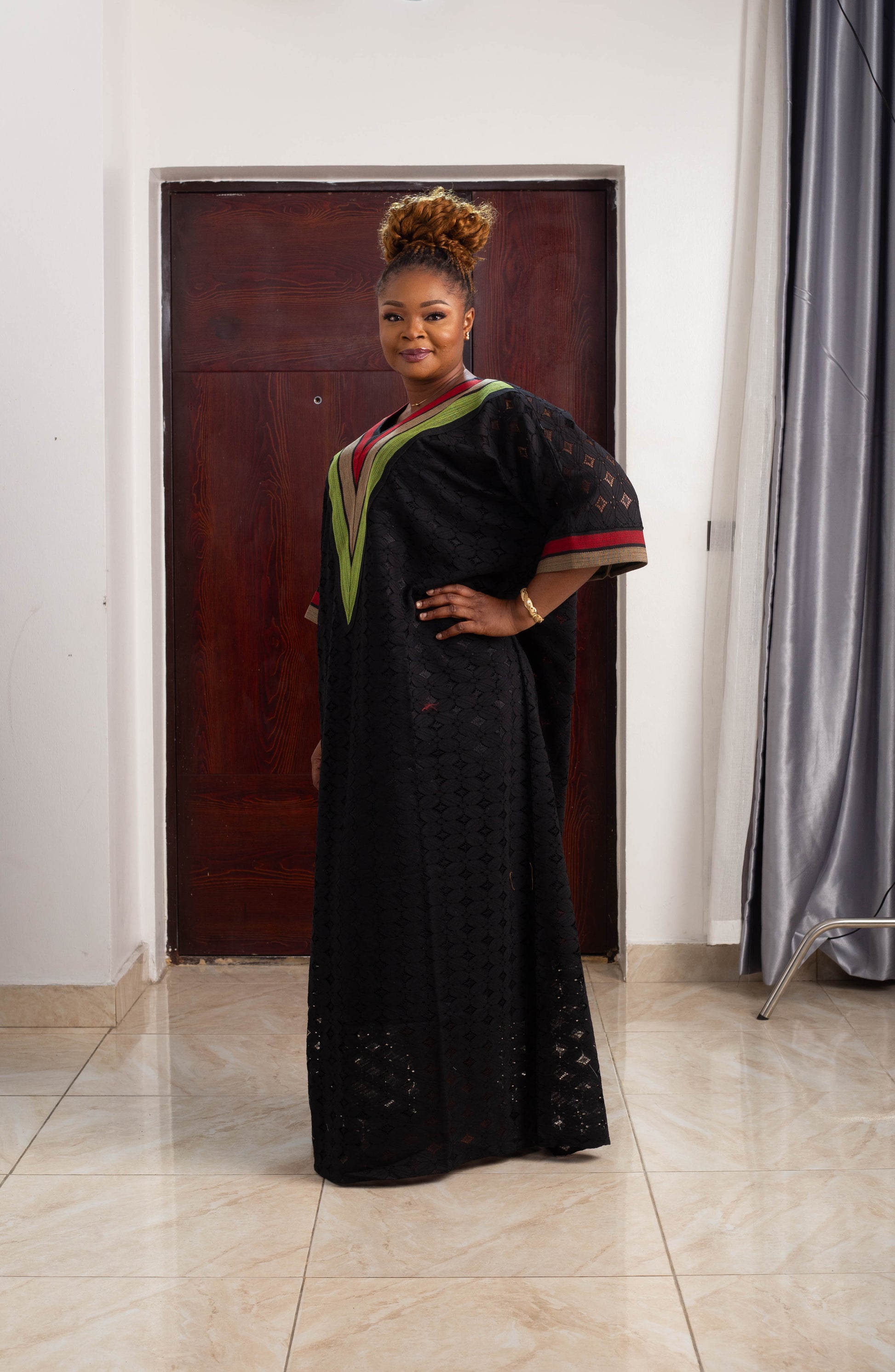 Its long, flowing silhouette is designed to flatter, offering elegance and comfort in equal measure. The soft lace detailing adds femininity and refinement, while the Aso Oke elements bring structure, richness, and cultural depth. This harmonious blend makes the gown a standout choice for high-profile occasions.