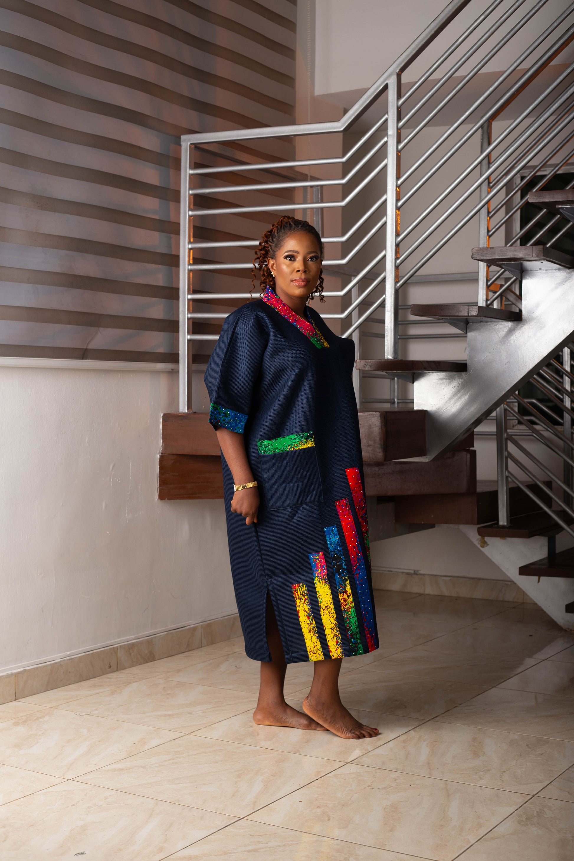 Its flowing silhouette offers comfort and freedom of movement while maintaining a regal presence. The intricate stonework highlights the Ankara patterns, catching the light elegantly and ensuring you stand out at any event. Designed with careful attention to detail, this piece embodies artistry, durability, and style.